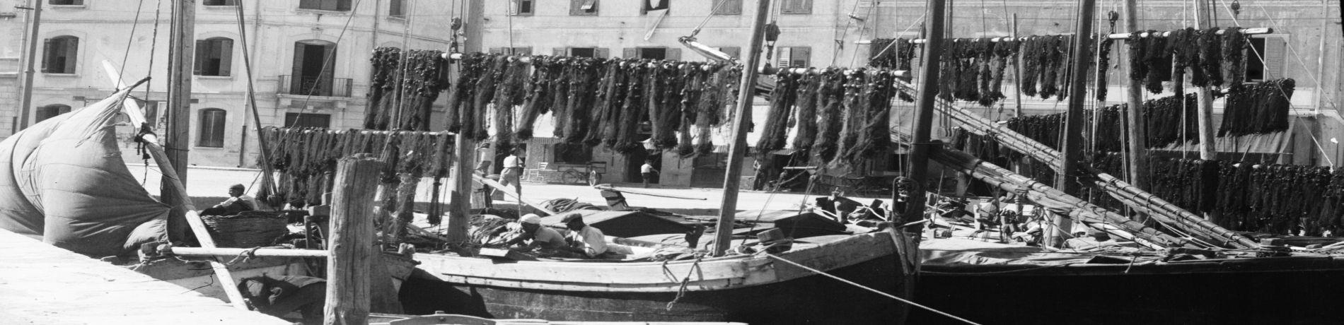 Barche e pescatori a Grado, in evidenza le reti appese al sole